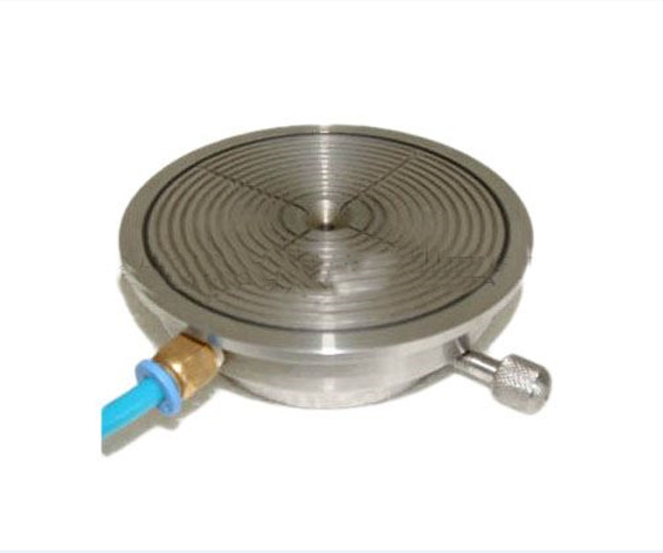 真空吸盘是我司自主设计研发的一款用于固定薄片状样件的精密真空用设备,吸盘上有一定的孔洞,即通过气动管路或一定的抽真空装置,通过吸盘上的孔洞抽走或稀薄密闭空间里的空气,使内外产生压力差,将样件和真空吸盘牢牢地挤压在一起,从而将薄片状样件吸附固定住。真空吸盘主要适合不适用于用粘结方法固定的,且能承受一定的吸力的样品。真空吸盘可与我司制造的SYJ-400划片切割机配套使用,用于切割或对薄片状样品划槽时吸附固定样品使用;可与真空旋转涂膜机配套使用,用于吸附固定将要进行涂膜的薄片状样品用。